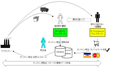 B御社のウェッブサイト内に、専用のアイコンを設けていただき、BI-MODE trader mode(すでに取引のある会社向け、信用取引)とEコマースmode(新規の顧客向けに、クレジットカード決済取引)それぞれ、御社のサイトのようにご利用いただけます。