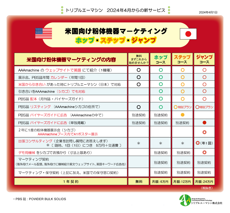 粉体機器の米国向けマーケティングサービス(ホップ・ステップ・ジャンプ)